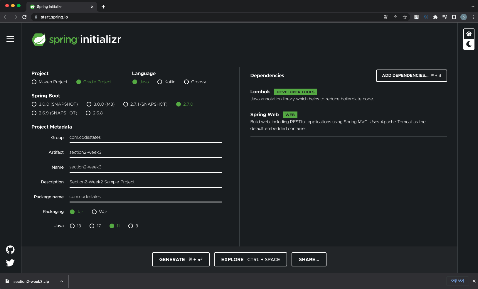 ADD DEPENDENCIES 에서 ‘Lombok’ 과 ’Spring Web’을 선택하고 GENERATE를 누른다.