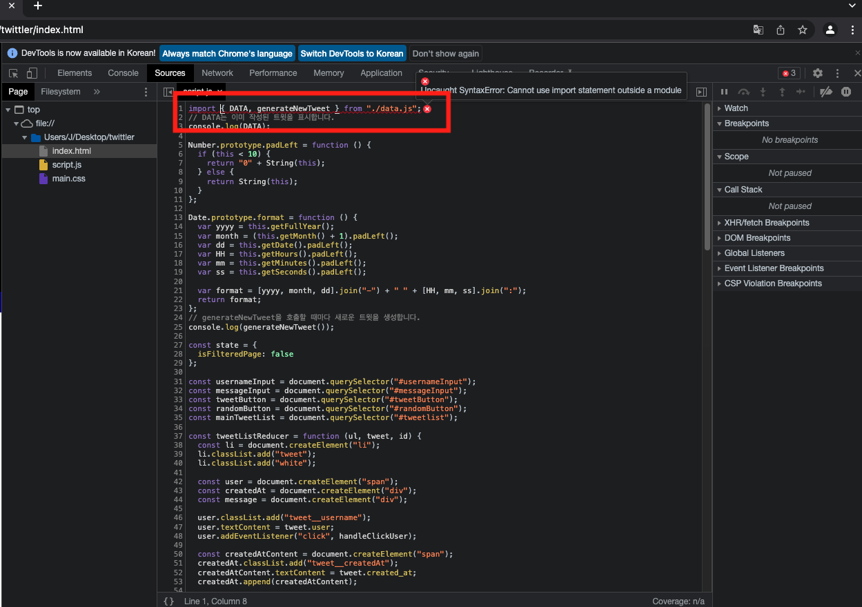 해당 오류 때문에 데이터가 들어있는 자바스크립트와 연결이 제대로 되지 않아 데이터가 화면에 나오질 않았다...