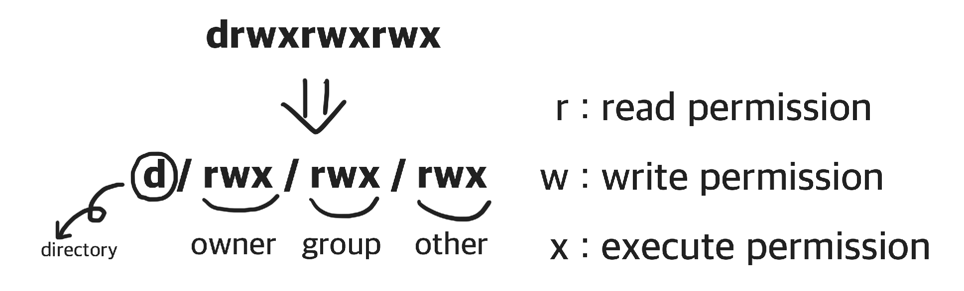 ▷ 첫글자 뒤에 이어지는 r, w, x는 각각 읽기 권한(read permission), 쓰기 권한(write permission), 실행 권한(excute permission)