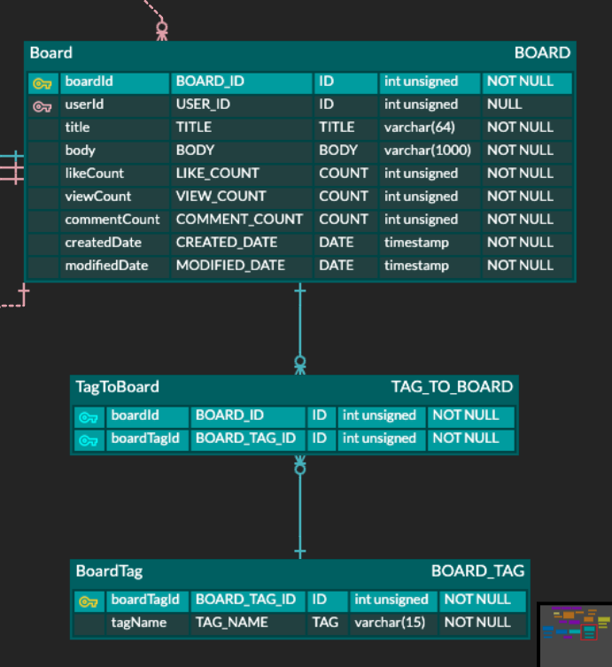 DB에 테이블 생성할 때는 테이블을 먼저 다 생성한 다음 PK 제약조건으로 'TagToBoard'의 'boardId'와 'boardTagId'를 PK로 만든 후 외래키 제약 조건을 걸어주면 설정이 완료 된다!