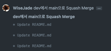 'Update README.md' 라는 내용의 커밋을 3개 남긴 후에 Squash Merge한 내용이다.